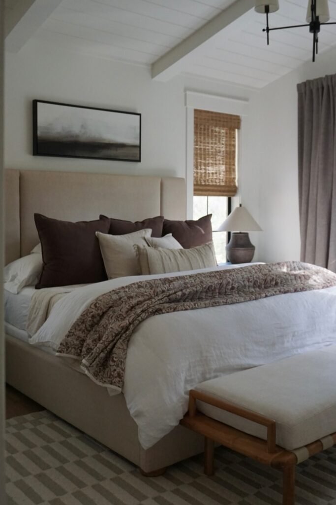 When you layer earthy pillows and a patterned throw over a neutral upholstered bed, you add depth without clutter.