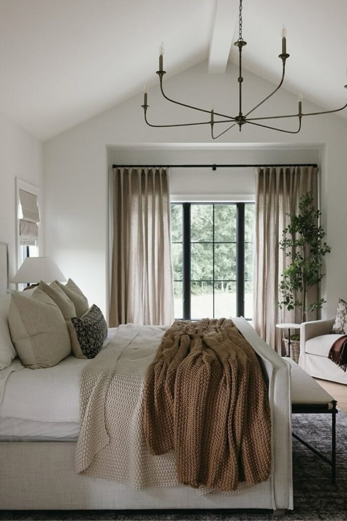 When you use soft curtains, pale walls, and a simple bed, everything stays open, and you should layer in chunky knit throws to add warmth.