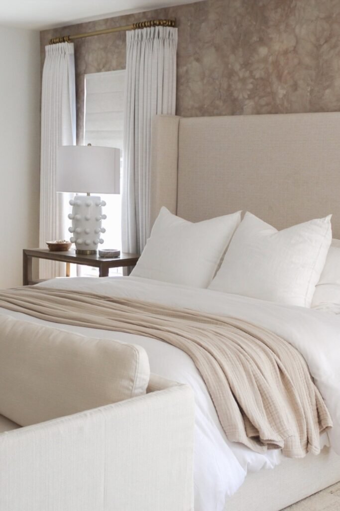 The warmth comes from texture, not color. Your layered bedding, an upholstered bed, and soft drapery keep everything relaxed and inviting.