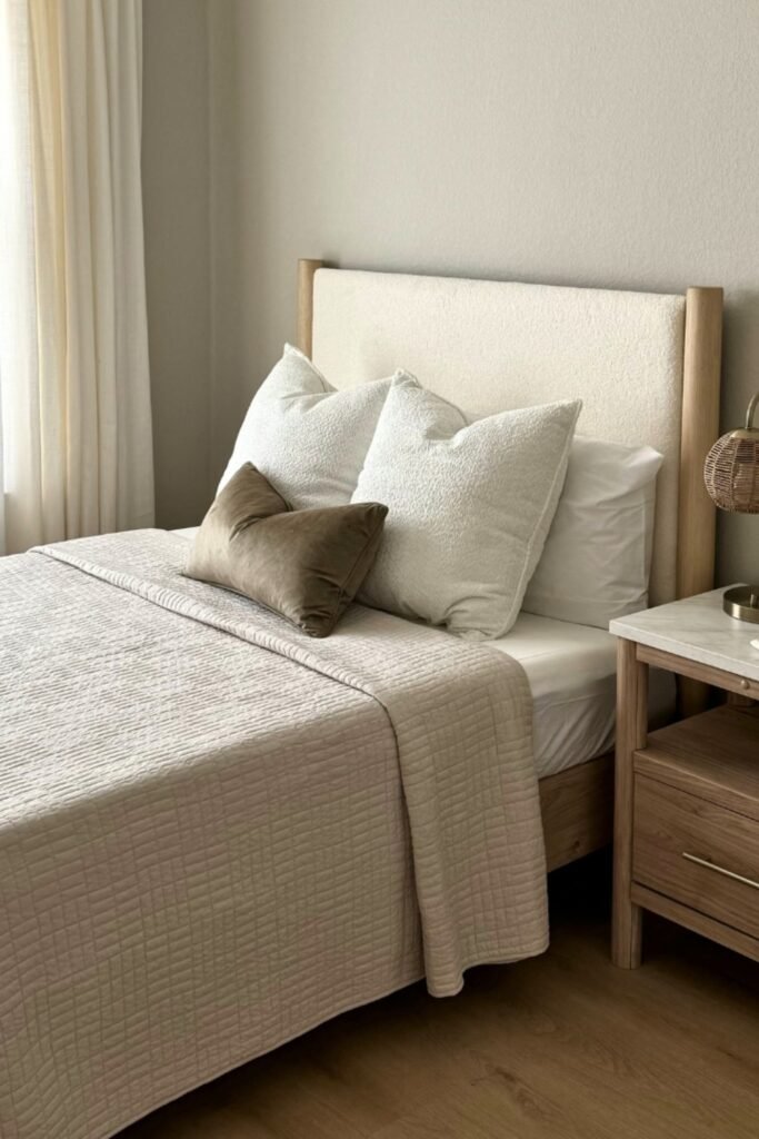 You should add softness through bedding and a small natural accent instead of extra décor, especially in small to medium bedrooms.
