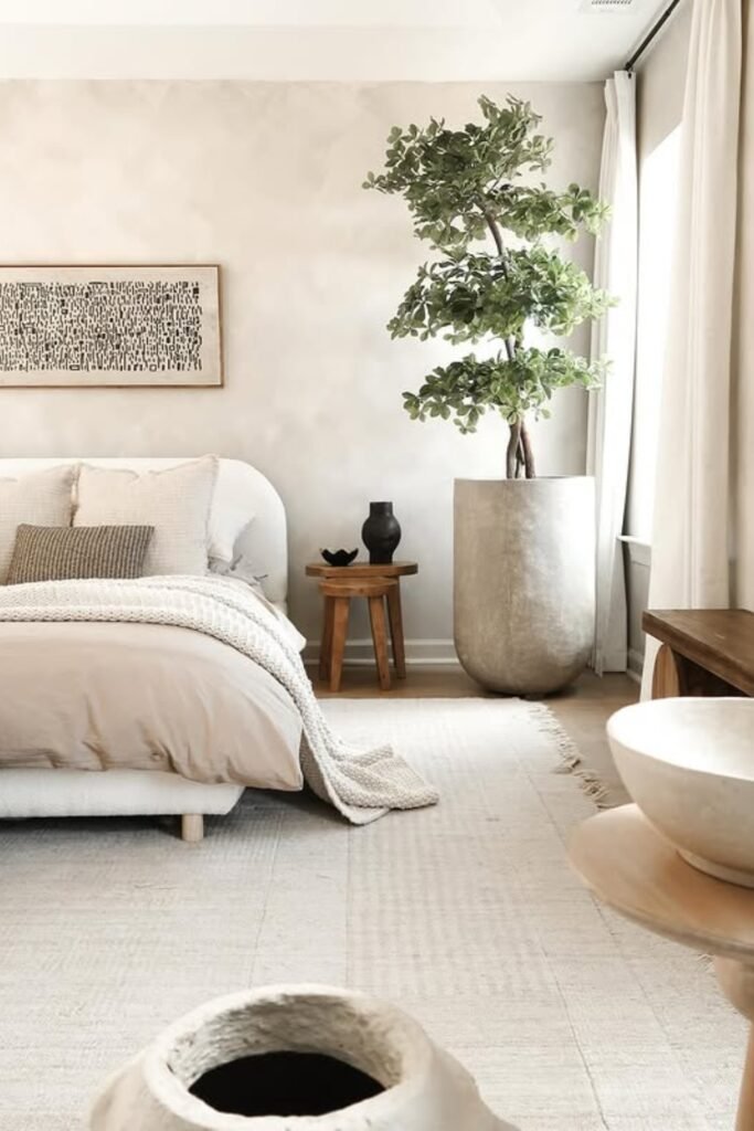 If your bedroom has good natural light and open floor space, you can pick one strong natural piece like a plant or stone planter and let the rest of the room stay quiet and simple.