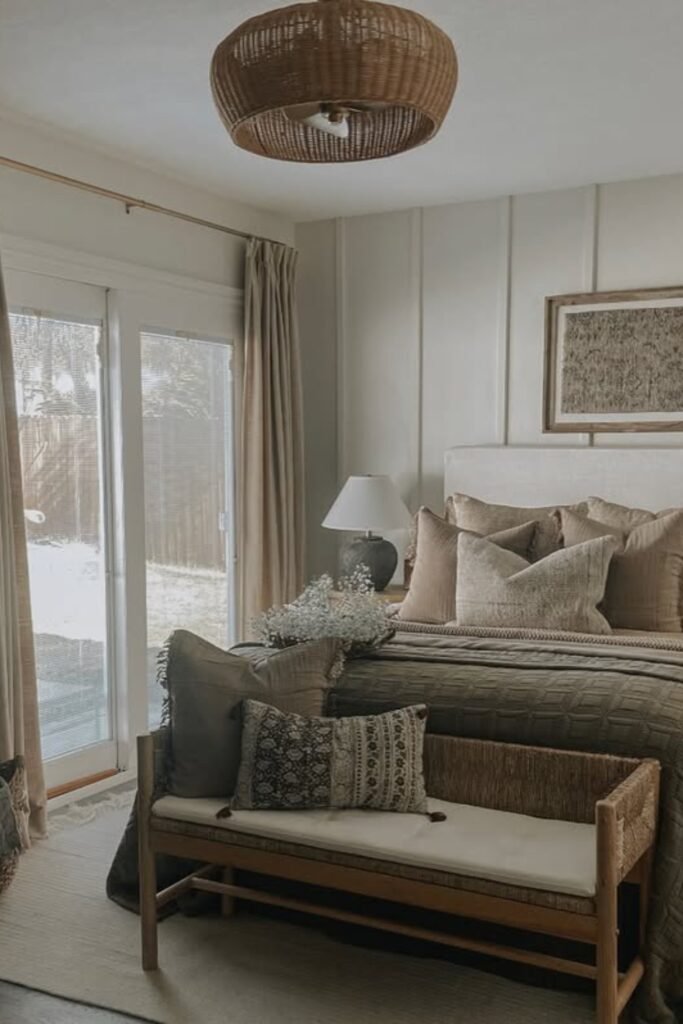 You have a padded headboard, layered bedding, and a woven bench, you can build comfort from the ground up.