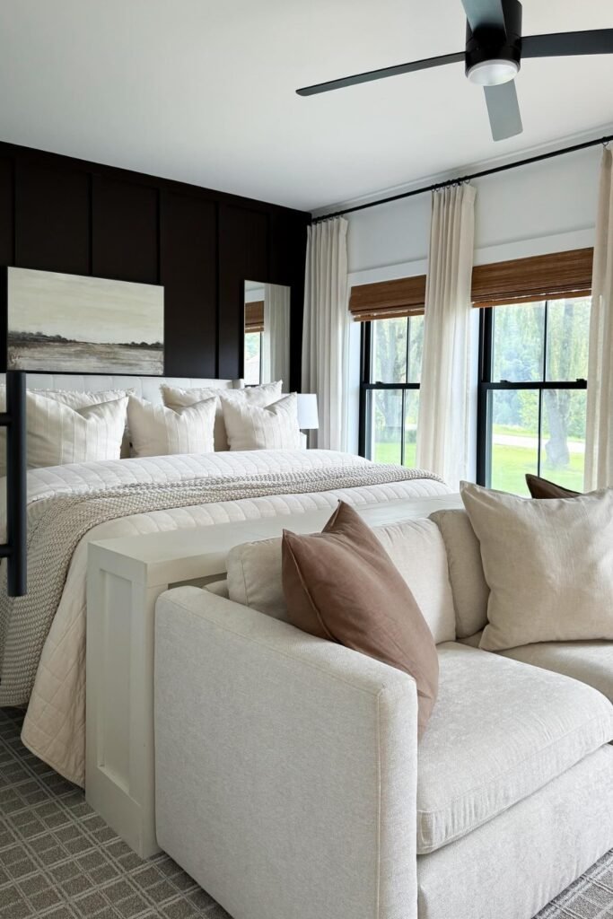 When you start with a soft upholstered bed and neutral bedding, you create a calm base, and then you can layer in darker pillows, curtains, and a wooden dresser for quiet contrast.