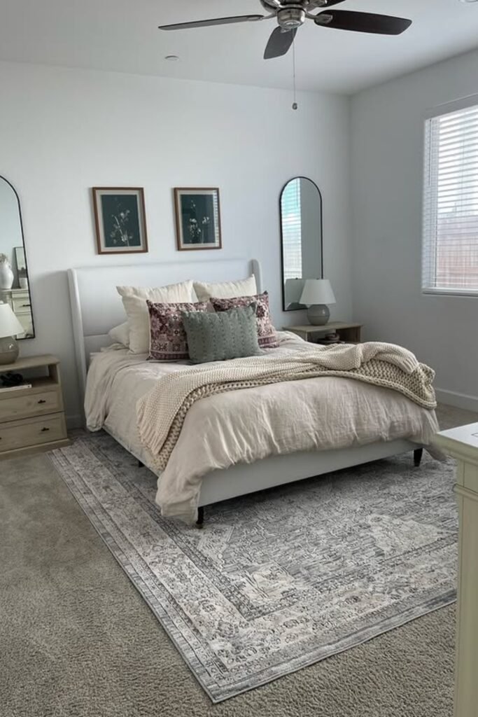 You should let the upholstered bed and soft rug ground the space without making it feel heavy. You can start with one statement light and then keep everything else calm and neutral.