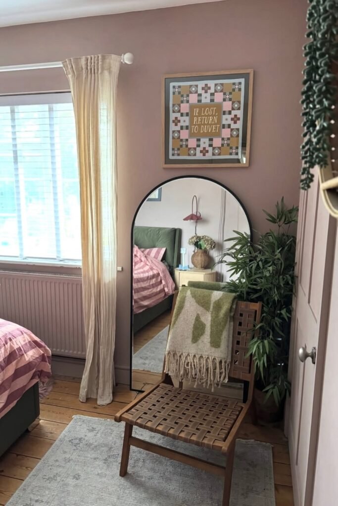 When your muted blush walls meet bedding and plants in green, you’ll see how the room stays soft but grounded.