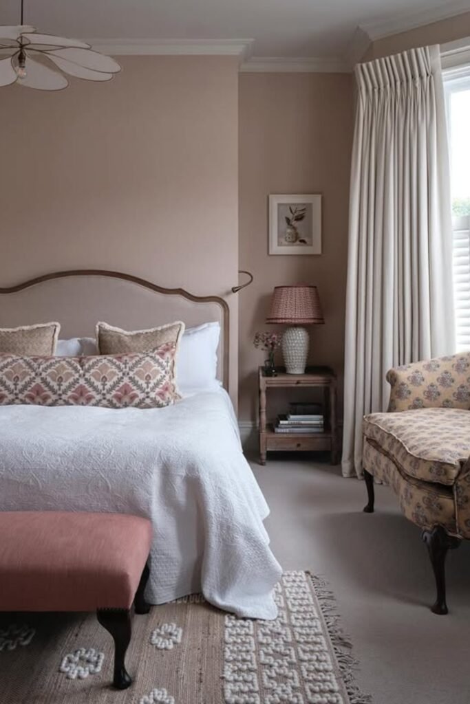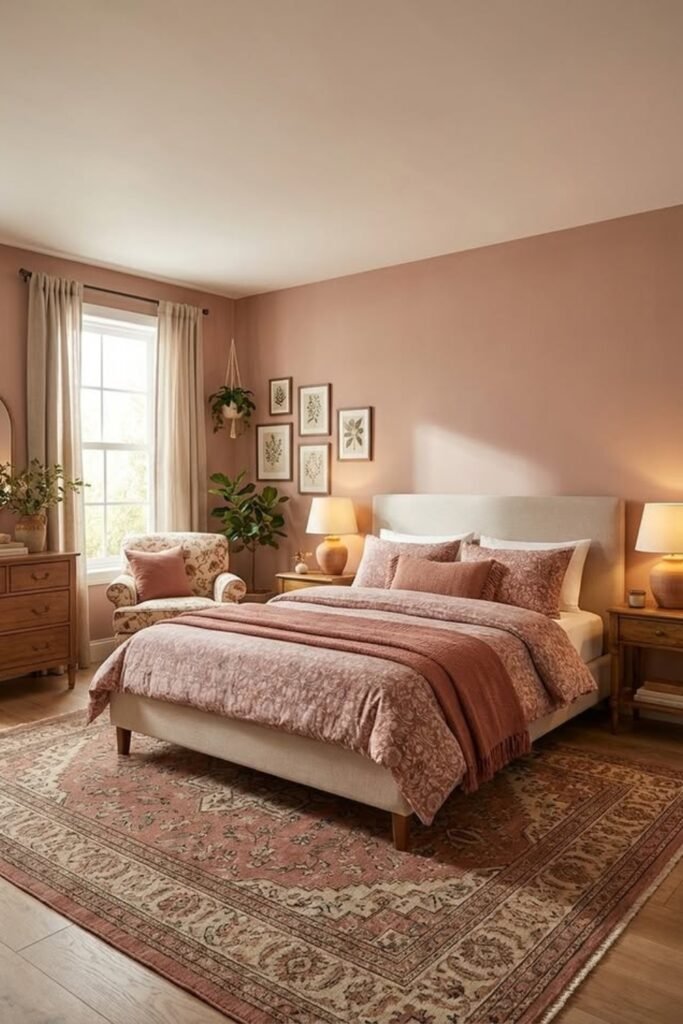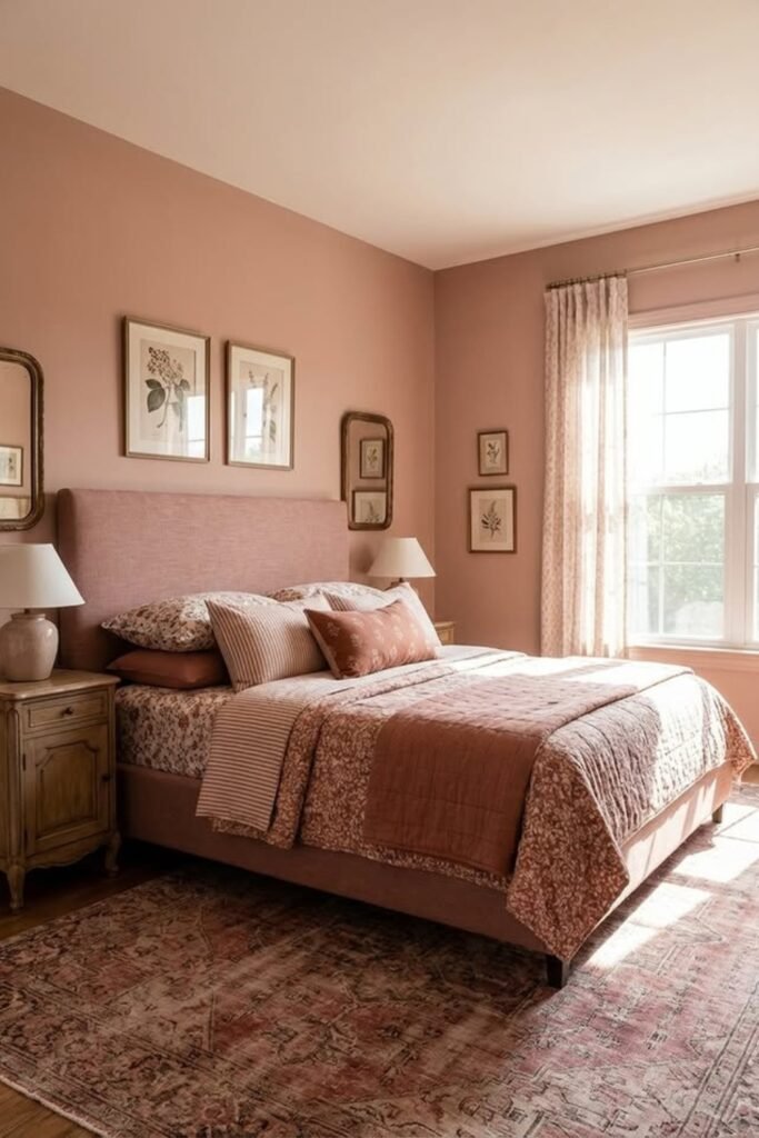 You can use a muted earthy rose on your walls and layer bedding in similar tones, and you’ll see how depth comes without the room looking busy.