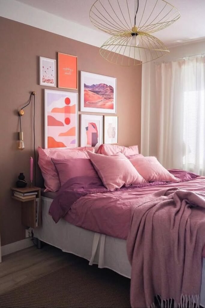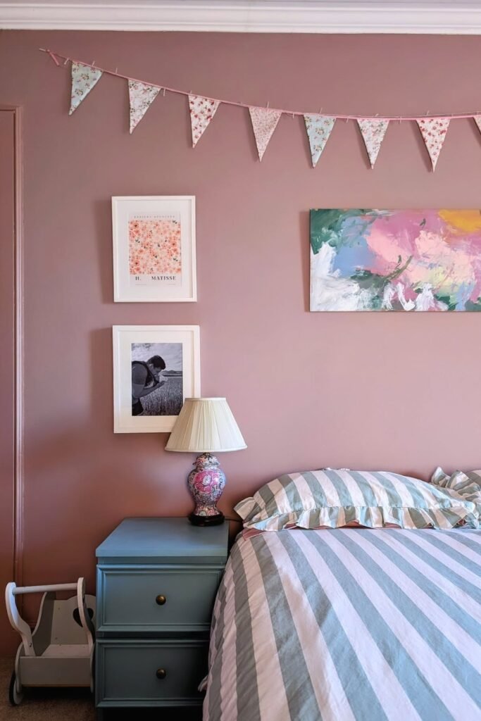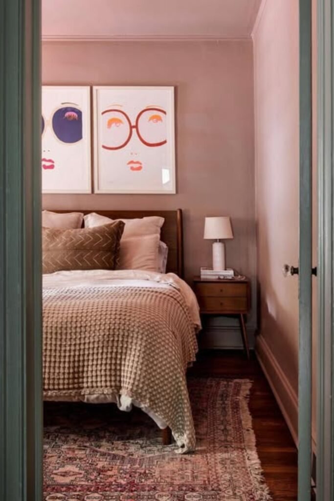 Sometimes, you might realize all you need is one strong wall. You can paint a deeper dusty pink behind your bed to create warmth without taking over the room.