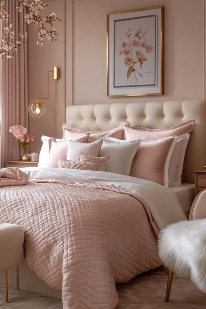 If you want pink to feel luxurious, you can keep it soft and polished. You’ll notice how a tufted cream headboard against warm blush walls instantly elevates the room.