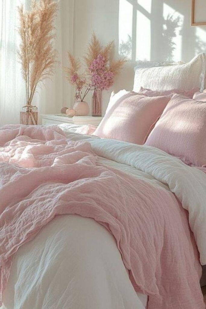 You don’t need pink walls to create a pink bedroom. You can let your bedding do the work.