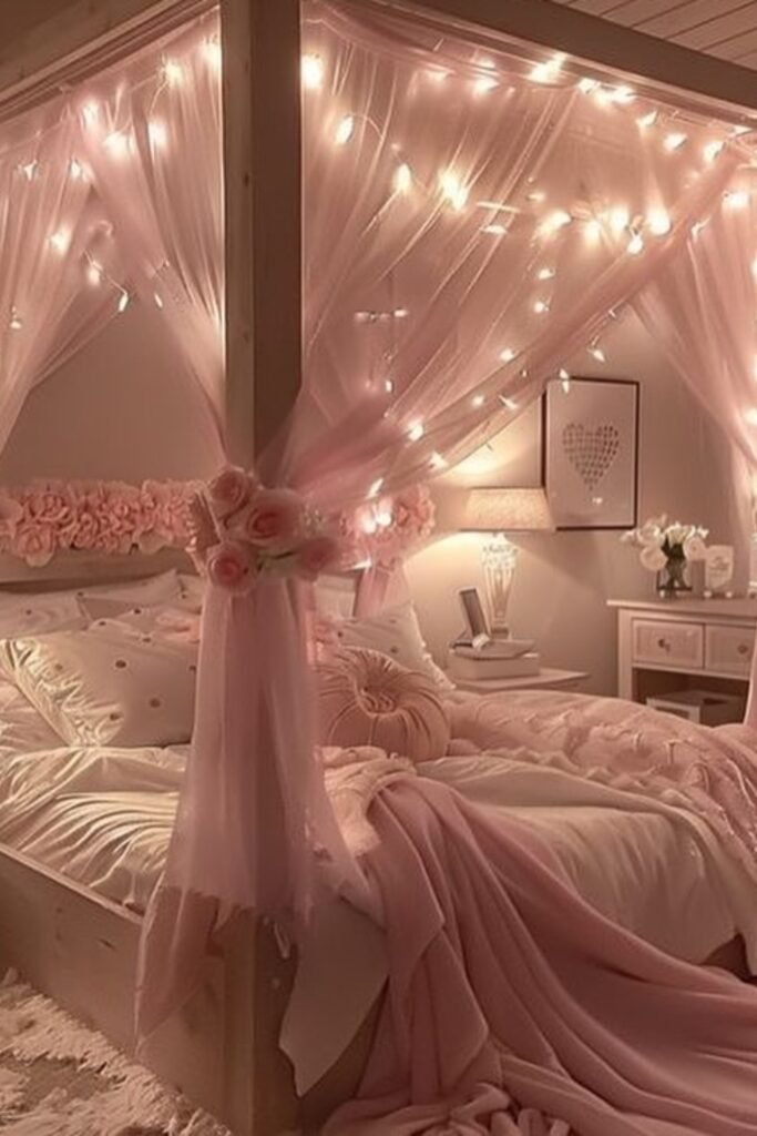 You can weave soft fairy lights through sheer canopy fabric, and you’ll see how instantly it creates warmth and depth.
