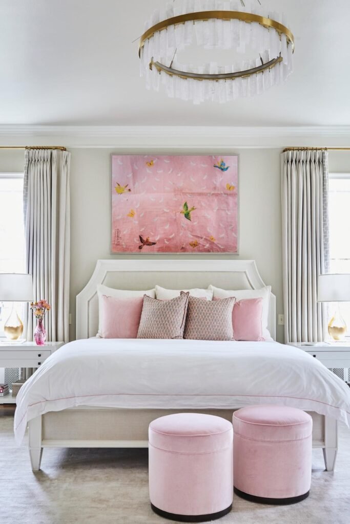 You can add a large pink artwork above the bed, and you’ll instantly set the tone, while matching pillows and ottomans tie everything together.
