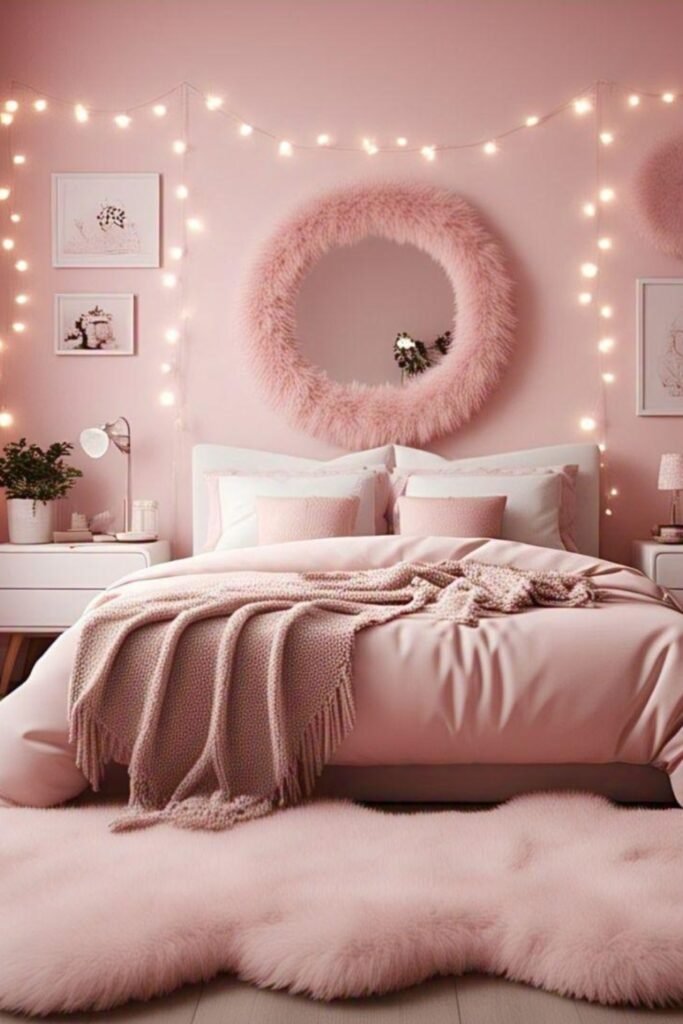 You might love pink but not want it to feel flat. You can play with light and texture, and you’ll notice how soft fairy lights around the wall instantly make the space feel warm and inviting.