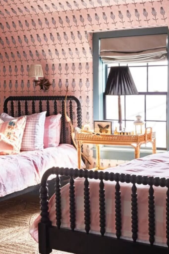 You can recreate this by choosing a repeating print in soft pink tones, pairing it with black or deep wood furniture, and keeping your bedding simple so the walls stay the star, you’ll love the effect.