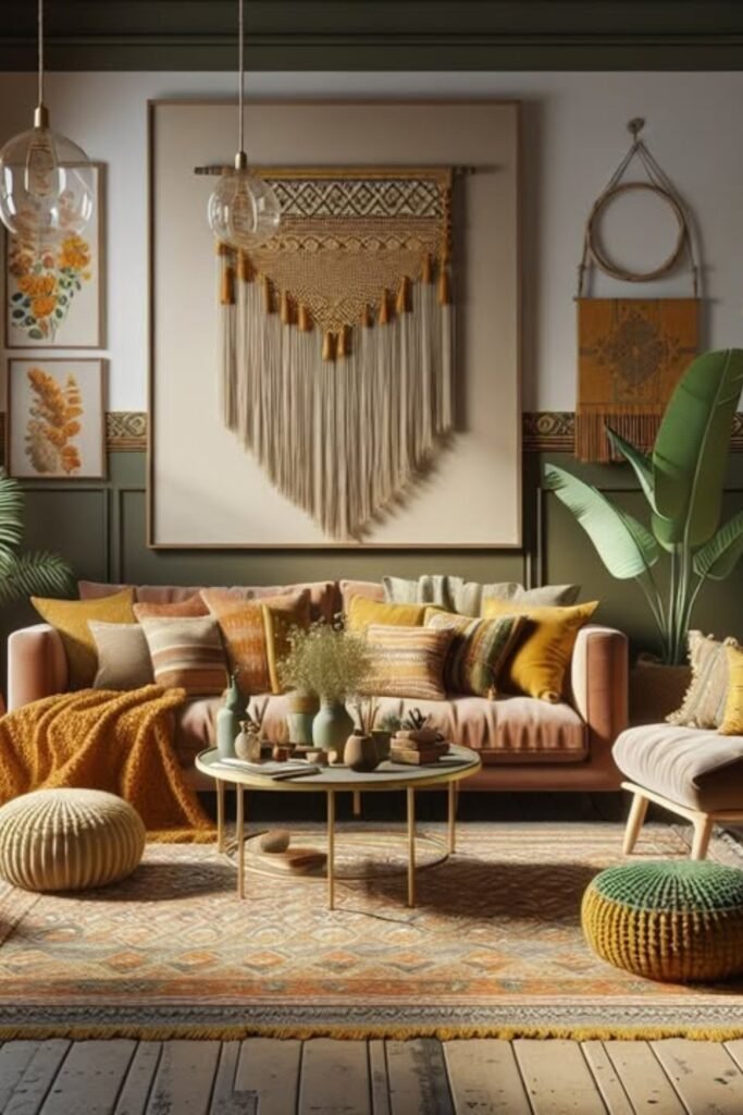 You can start with warm mustard, olive, and clay tones. You can add woven wall hangings, textured pillows, and natural wood accents, and you will see how the fabrics do all the talking.