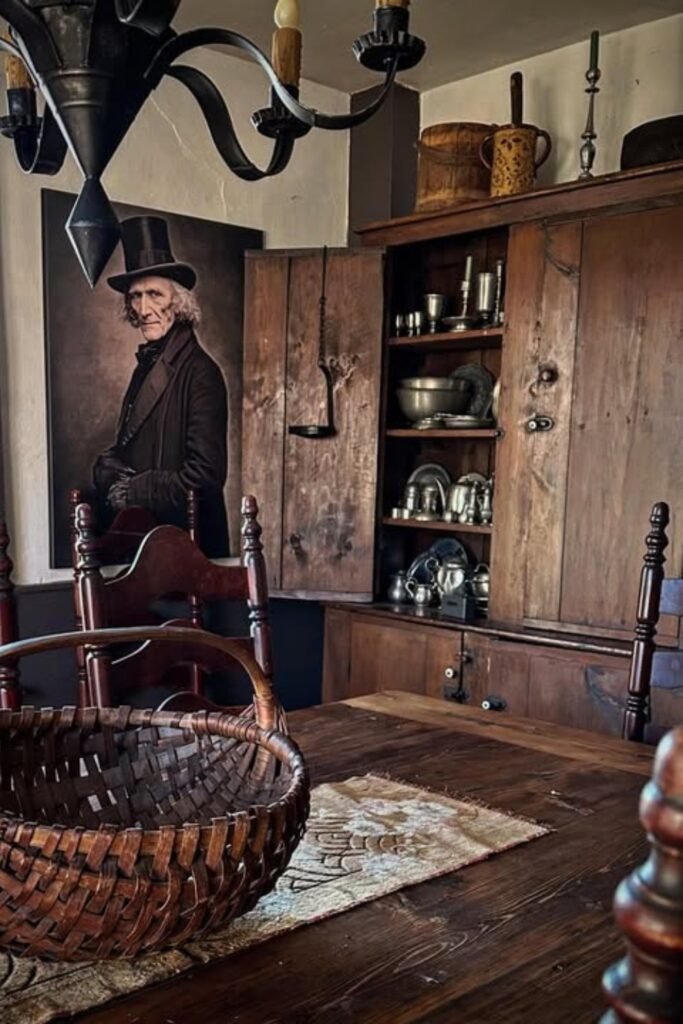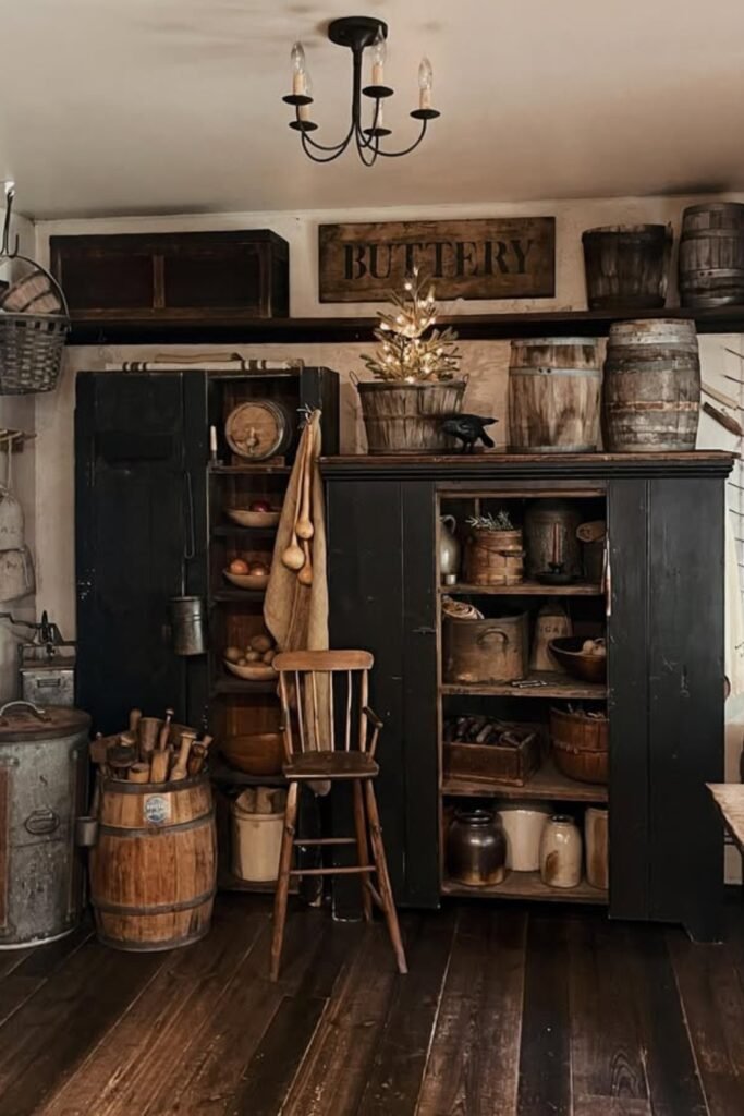 You can make storage part of your story. If you use a dark cabinet filled with crocks, barrels, wooden bowls, and simple linens, you will add instant primitive character.