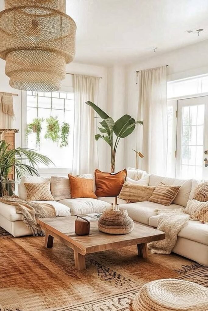 When you add woven textures like jute poufs or baskets, you will see how the room feels handmade and cozy.