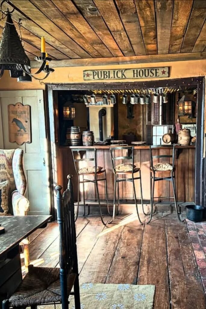 You can turn your living room into a conversation spot by borrowing the feel of an old tavern.
