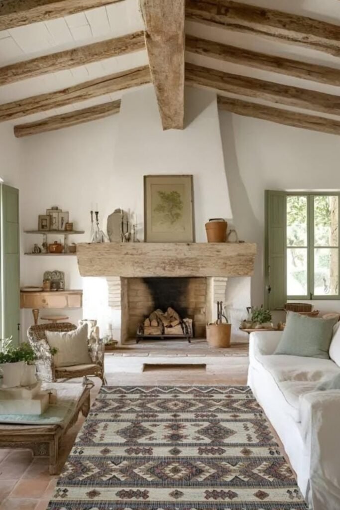 You can keep your walls light so the beams stand out. You can add a simple wood coffee table and a soft neutral sofa, and you will see how everything balances perfectly.