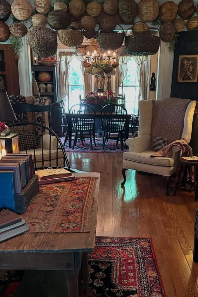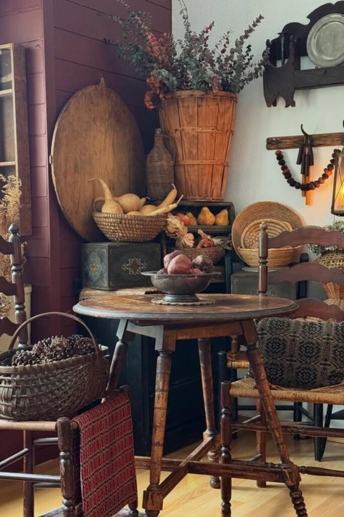 If you stack woven baskets, wooden trays, old crates, and simple lanterns, you will build a layered primitive moment.