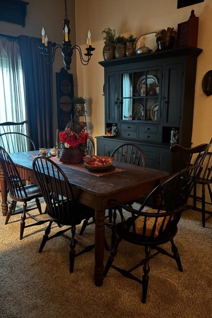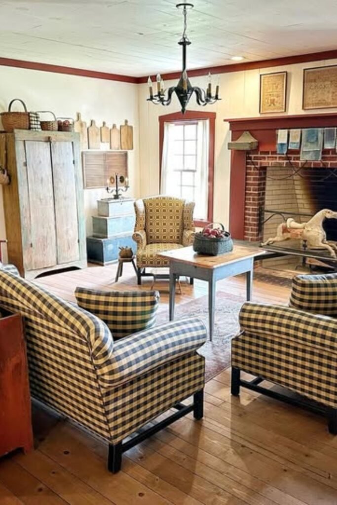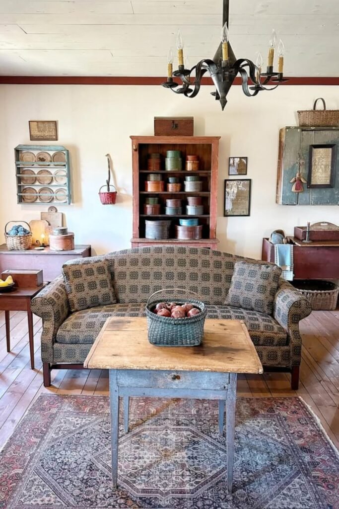 This works beautifully in bright living rooms where you want primitive charm without heavy colors or clutter.