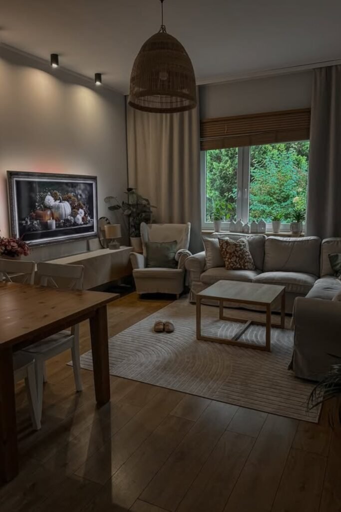 If your living room feels styled but still empty, swap decorative objects for tactile materials. You can use woven lamps, fabric chairs, and natural wood to build comfort that feels lived-in.