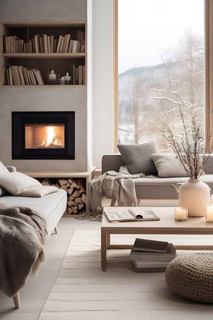 When you want a natural center, a fireplace instantly grounds the living room. You can arrange sofas facing inward, keep textures soft, and maintain light colors so the space feels calm.
