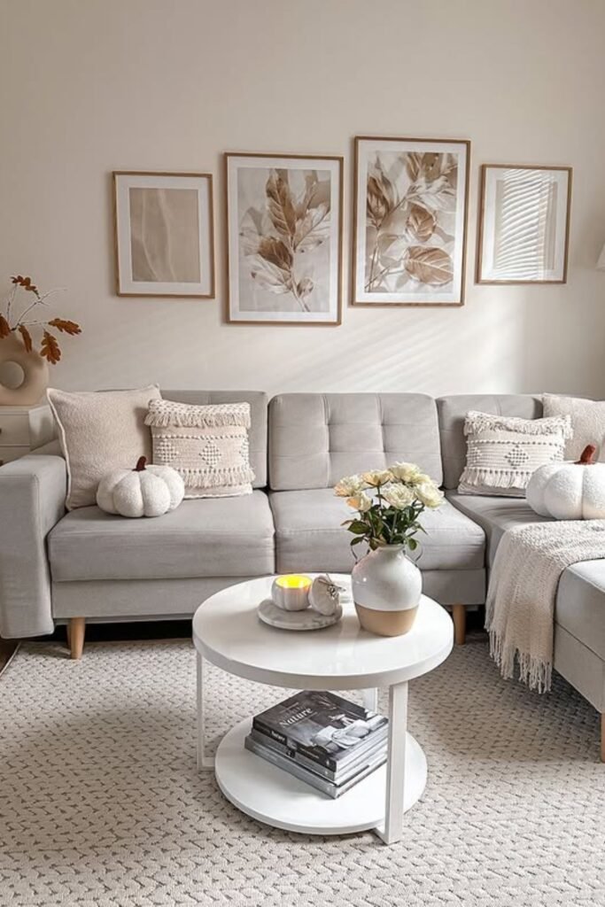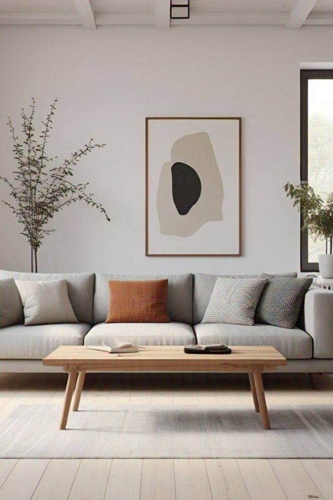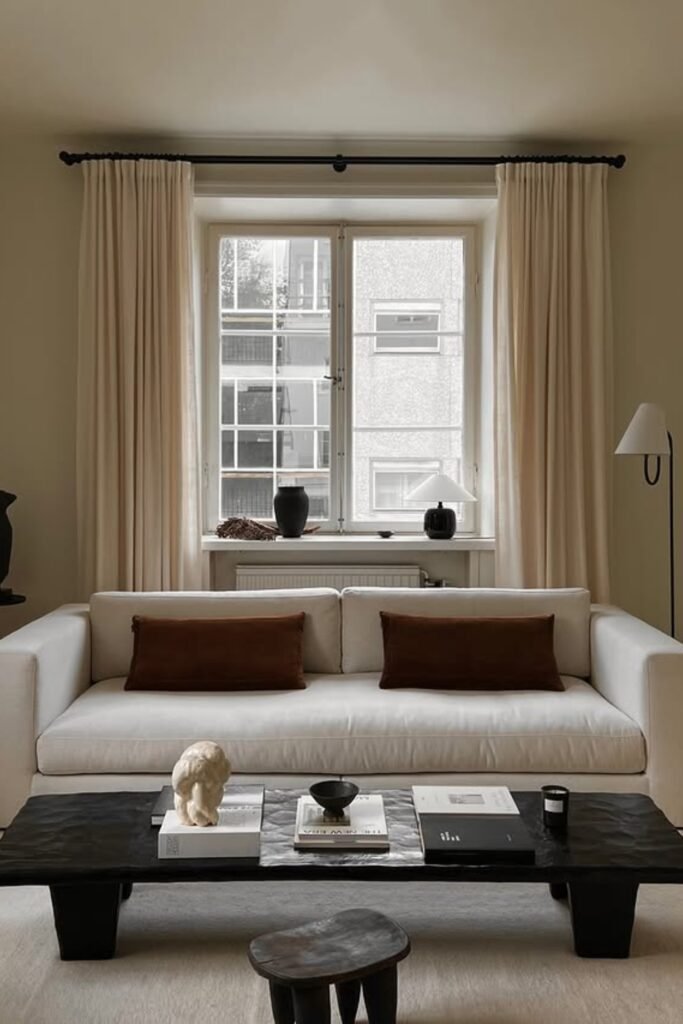 A calm living room doesn’t mean everything has to match perfectly. You can keep a soft neutral base while letting one deeper accent like a warm cushion or dark artwork, quietly add focus.