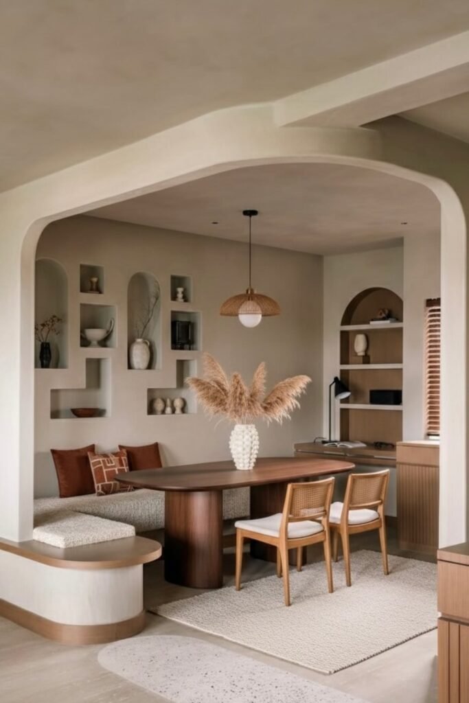 The rounded openings, shared colors, and similar materials help everything feel calm and connected instead of chopped into rooms.