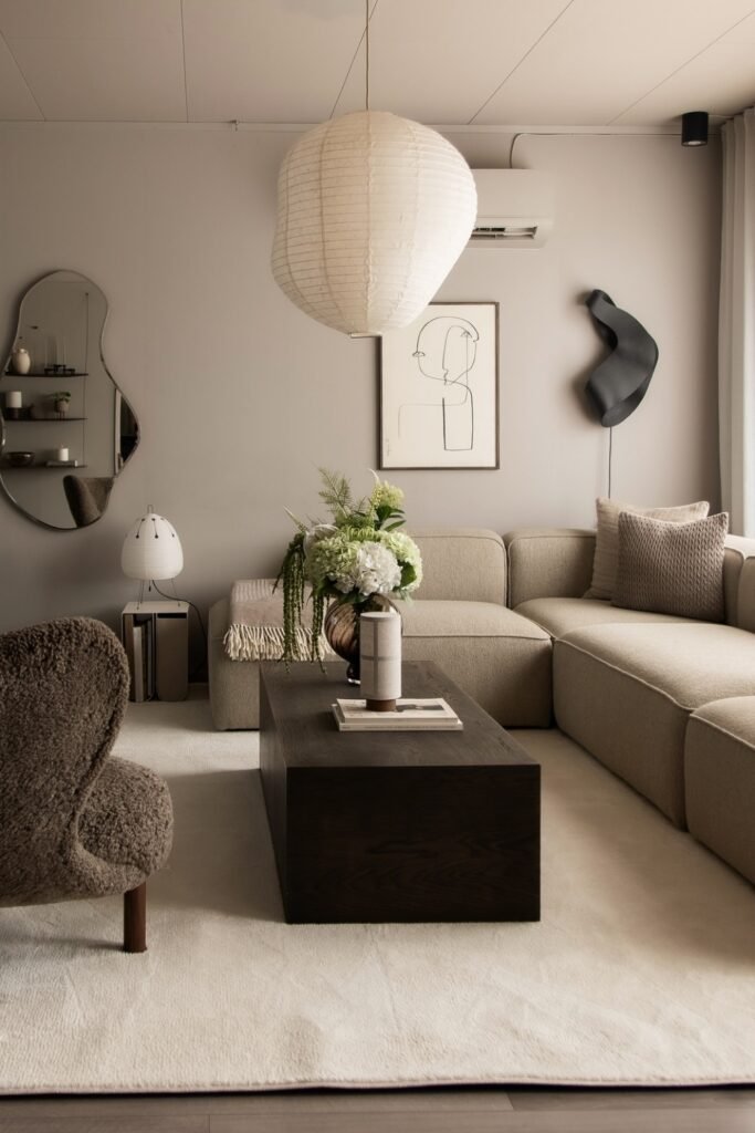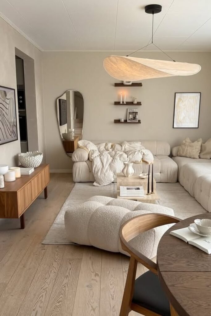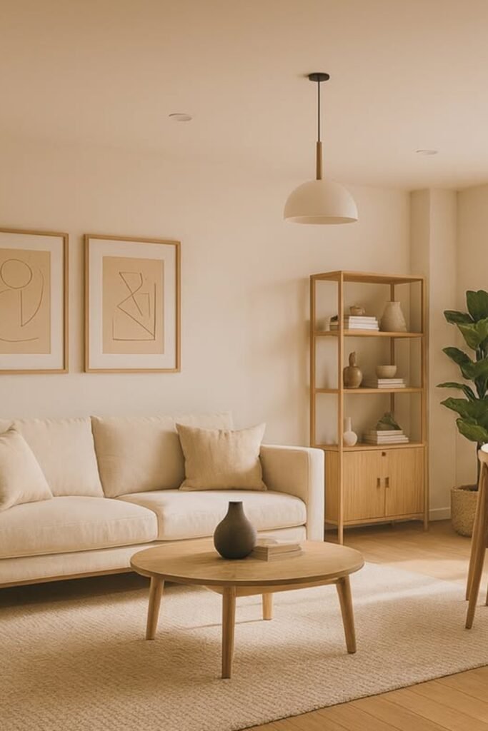 A Scandinavian living room doesn’t have to stay pale to feel calm. You can use warmer neutrals to keep things grounded.