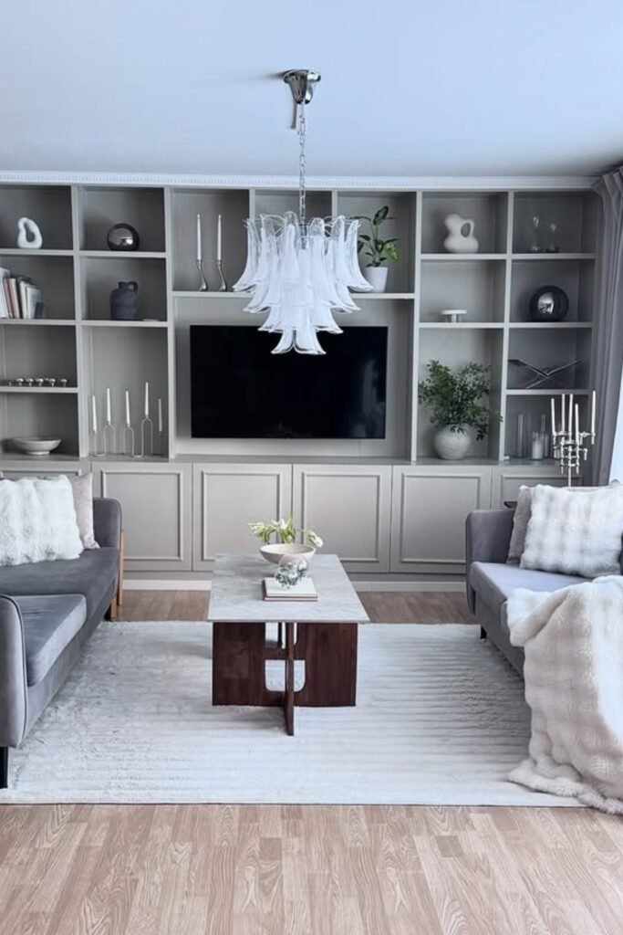 You can install full wall shelving to add height and interest without cluttering the seating area. If your living room feels bare or too quiet, build vertical interest instead of adding more furniture.