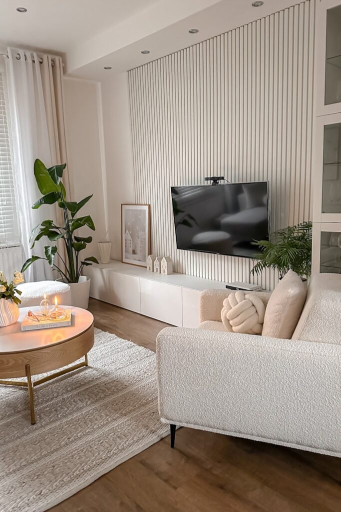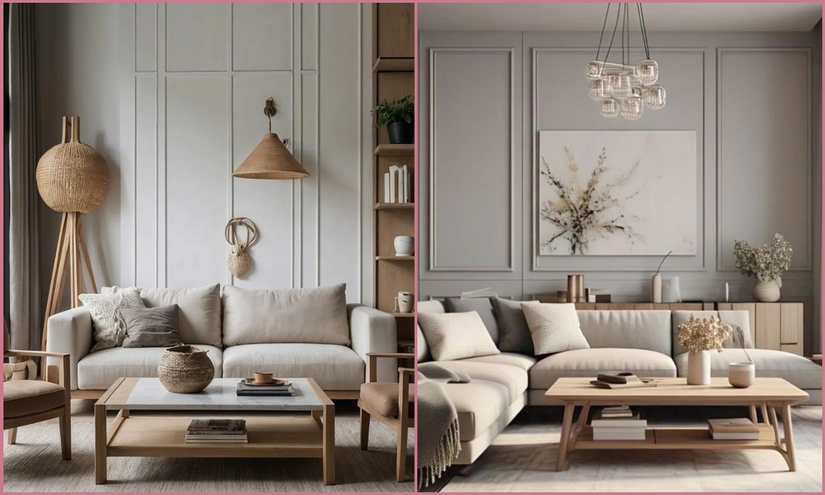 If your living room feels too plain, don’t change the color palette; change the surfaces. You can mix matte, soft, and natural finishes so the room stays calm but never feels empty.