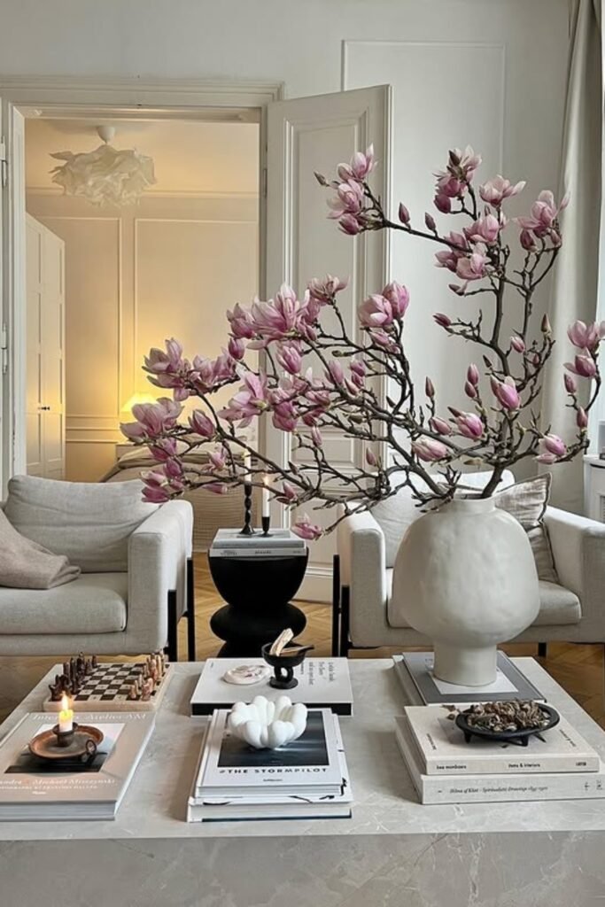You can use an oversized branch arrangement to anchor the space and draw your eye without adding clutter.