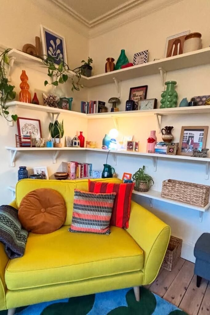 You can use a bold sofa to set the tone and then repeat smaller pops of that color across your shelves so the chaos feels intentional.