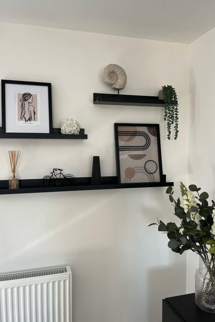 You can make black shelves instantly sharpen a soft living room. The dark lines pull art and small décor forward without needing heavy styling.