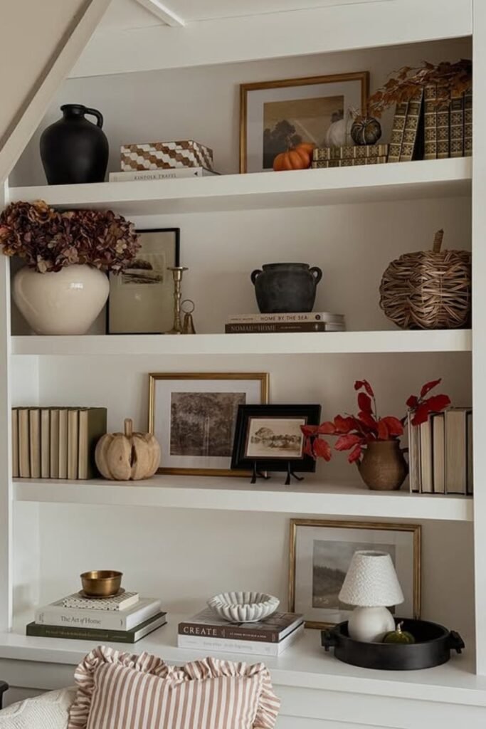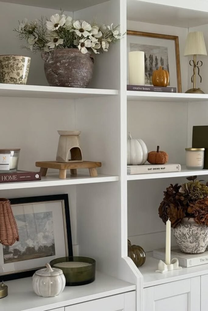 You can make autumn tones steal the spotlight and give your shelves a cozy, lived-in pull.