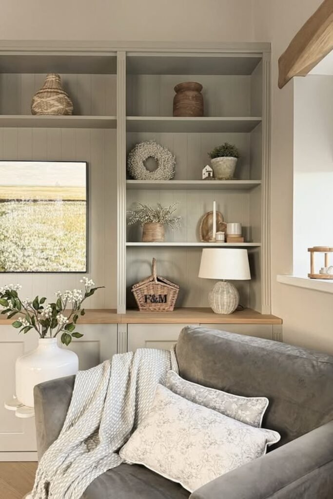 You can make your living room feel layered but not loud by mixing books with small art, pottery, and one soft basket to keep the look relaxed.