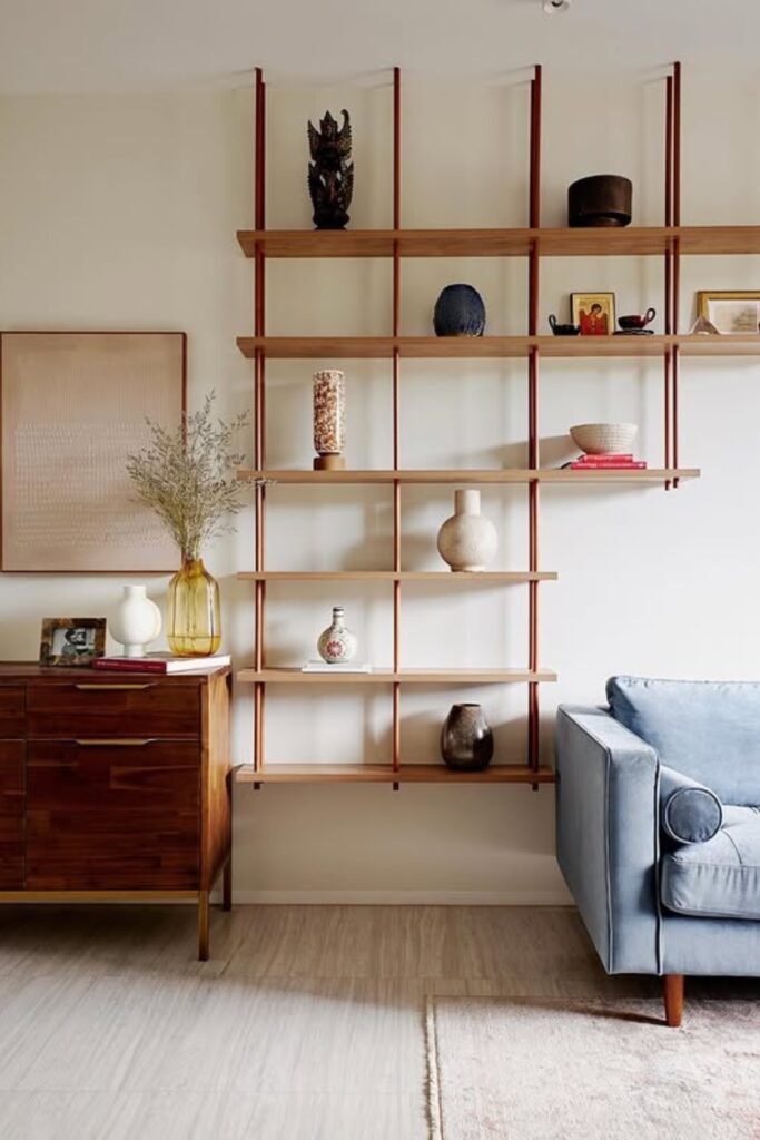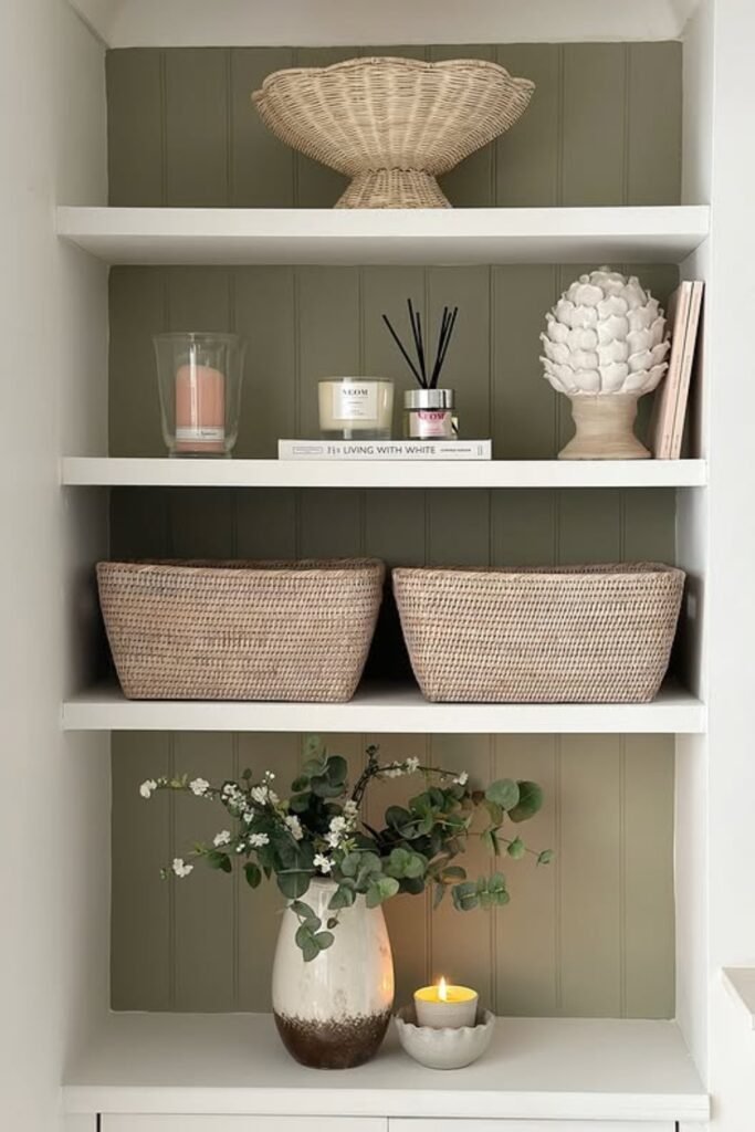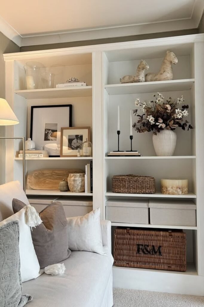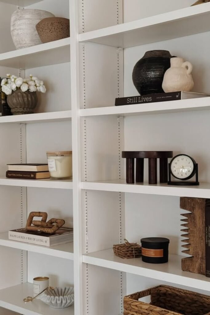 Don’t forget to drop in one personal item so the shelves feel like your home, not like a store display. If you want your shelves to feel calm, you can keep the color palette tight.
