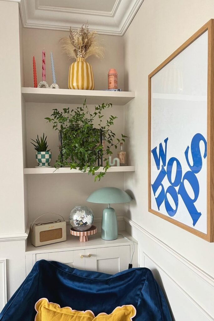A bold chair sets the mood, then shelves echo that energy with plants, bright candles, and one glossy accent.