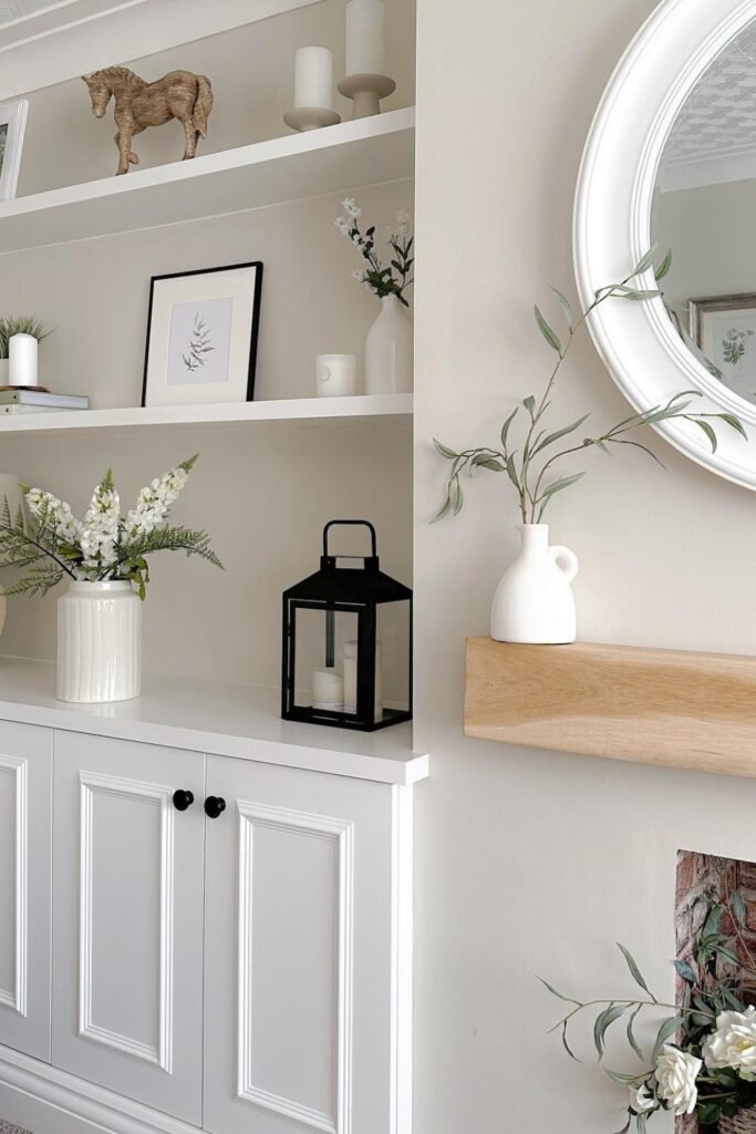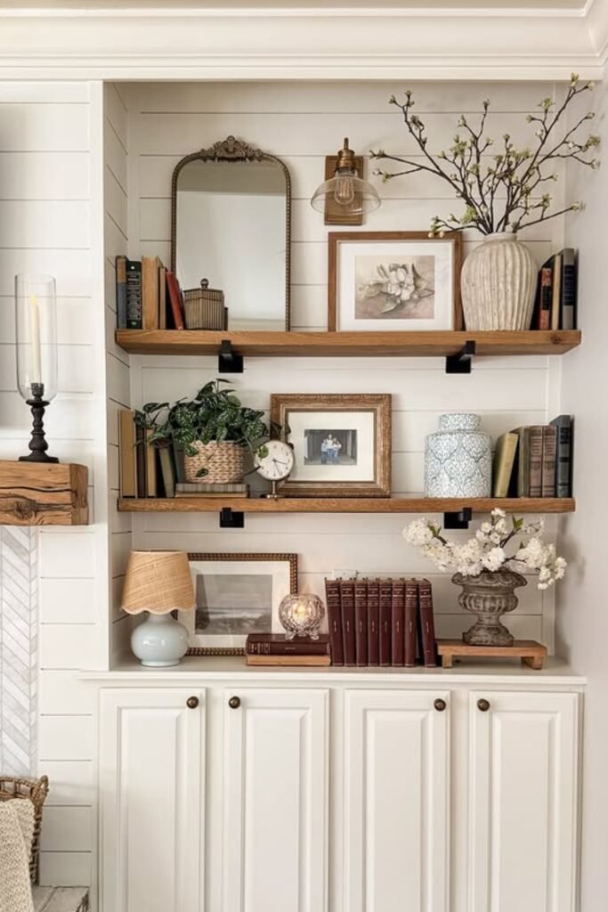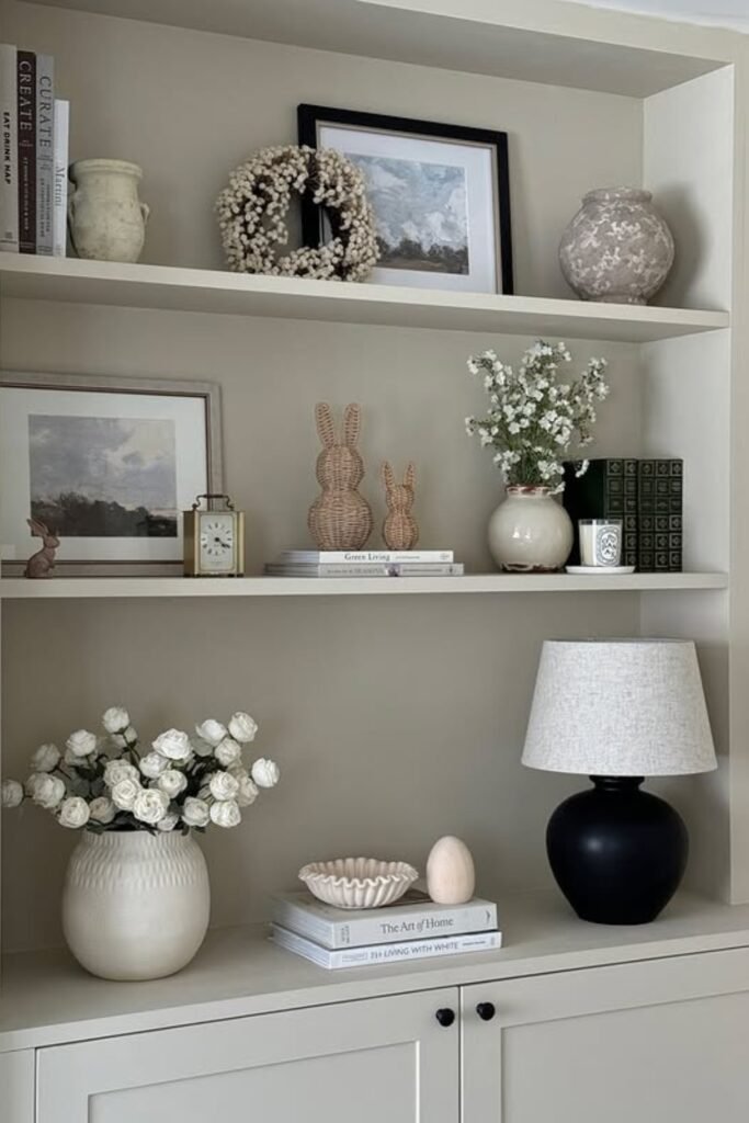 You can make small swaps each season like changing flowers, switching a tray, or rotating artwork, to keep your shelves feeling fresh.