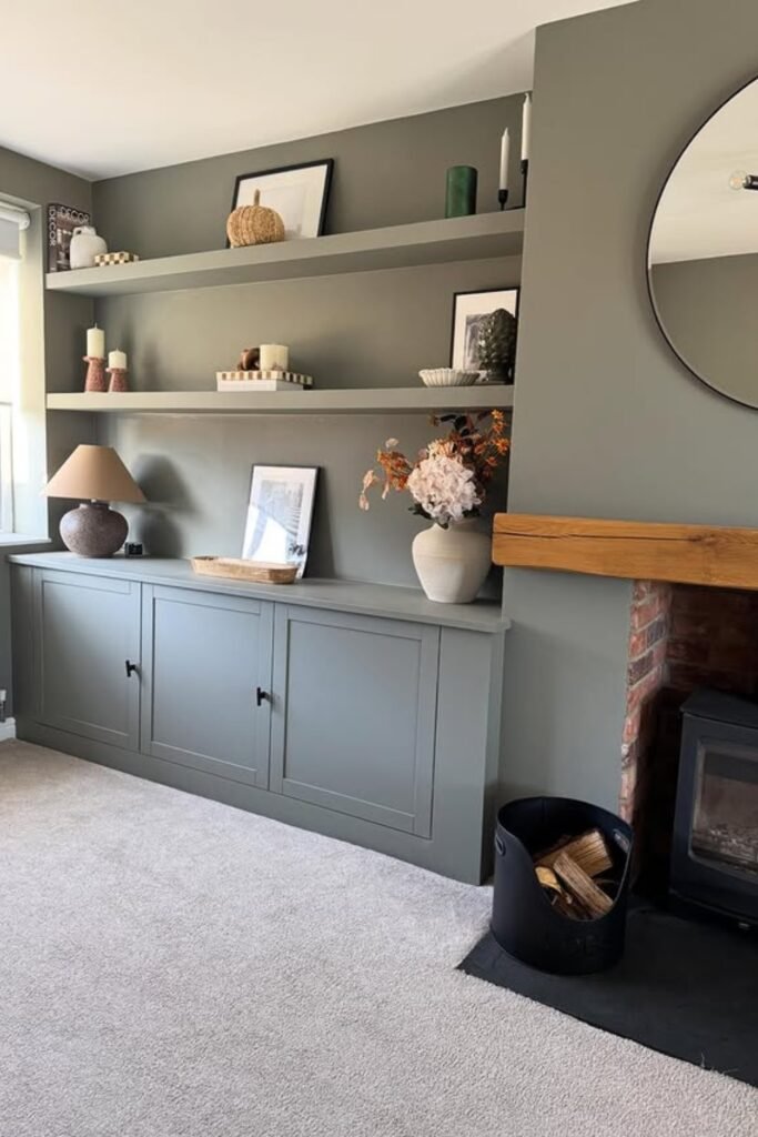 Let the shelves echo your fireplace wall so the whole living room feels like one calm zone.