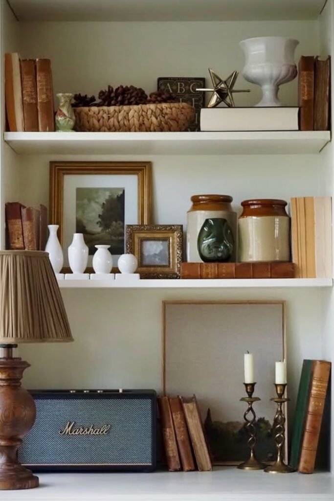 You can tell a story on your shelves with old books, ceramic jars, and brass touches.