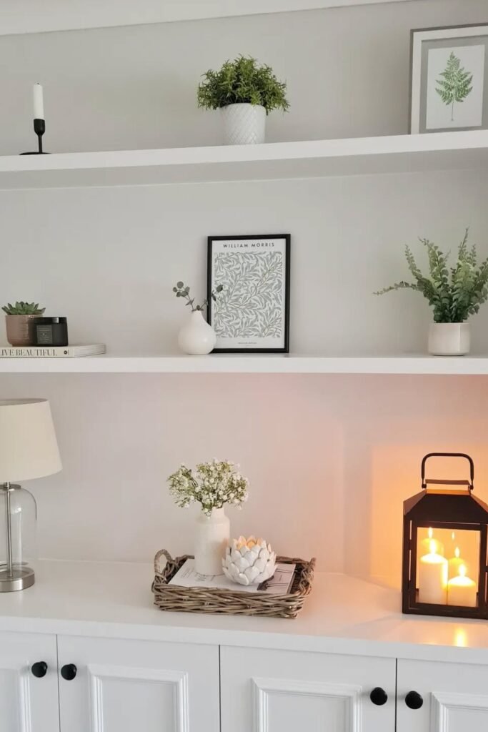 You can keep your upper shelves calm by spacing out greenery and adding just one framed print so you don’t feel visual chaos.