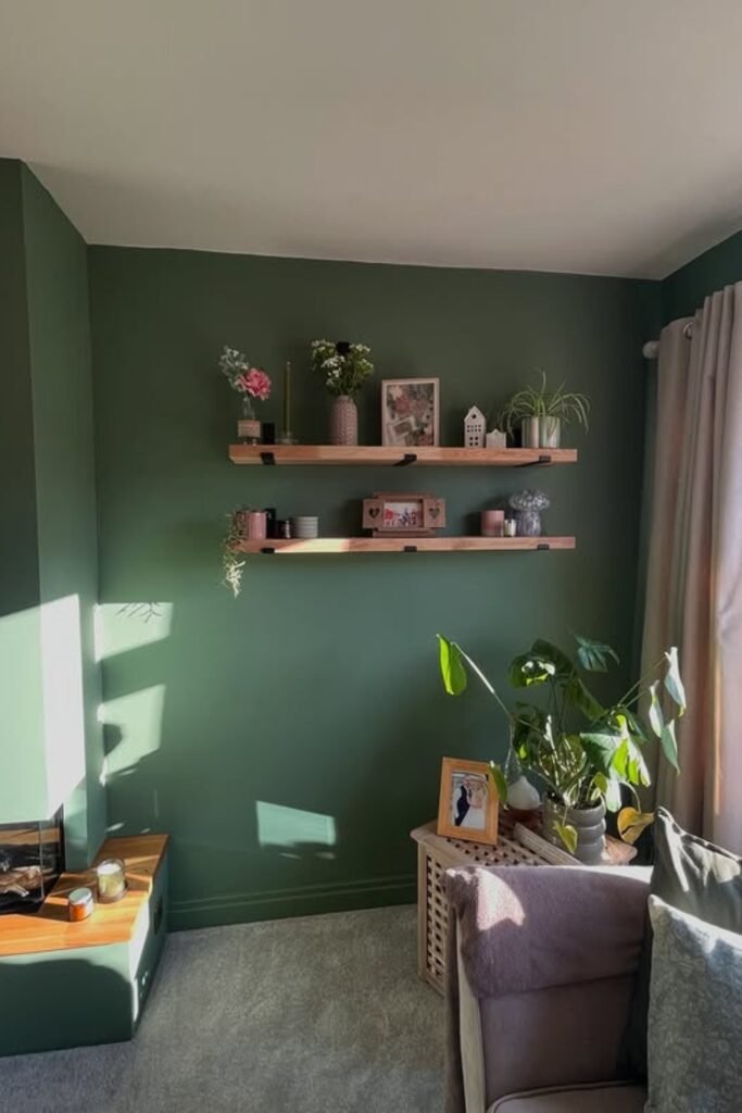 When you have bold green walls, you can keep your shelves light and airy to balance the drama.