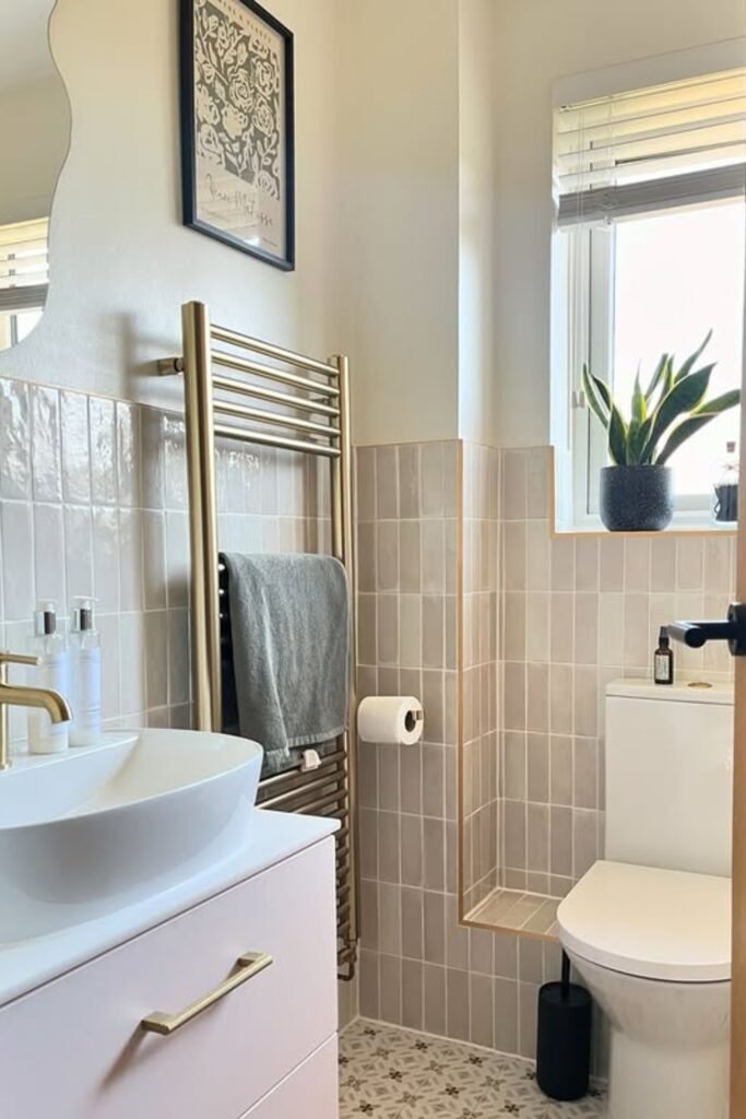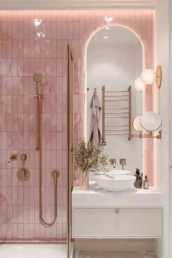 You can instantly set a soft, luxe tone with glossy pink tiles, while brass fixtures bring warmth and polish.