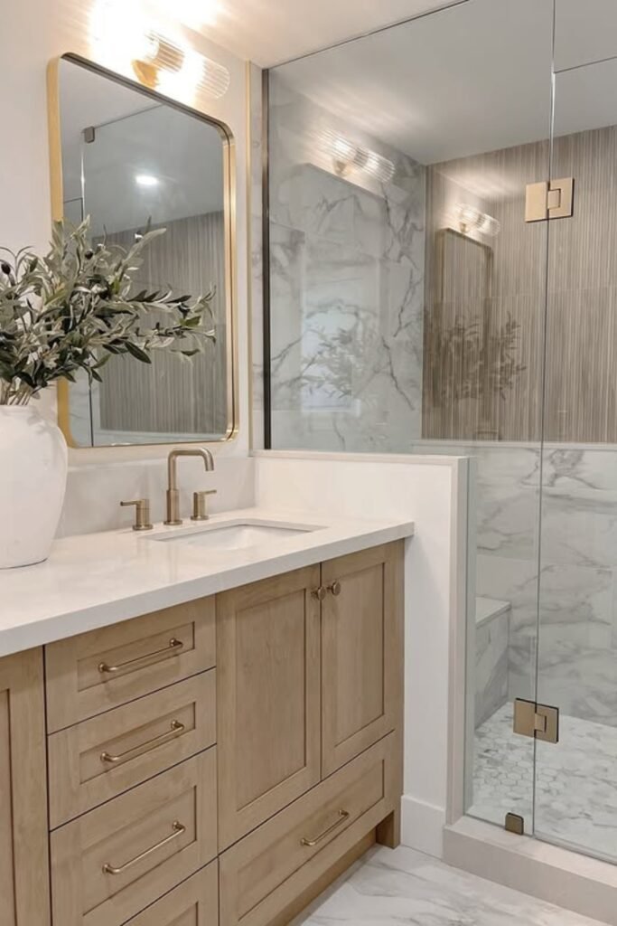Let subtle gold finishes warm up the marble backdrop, and keep the half-height divider so you maintain an open shower without crowding the vanity.