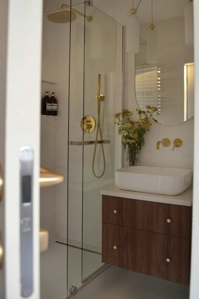 You can make a compact bathroom feel open and elegant with frameless glass and soft brass fixtures.