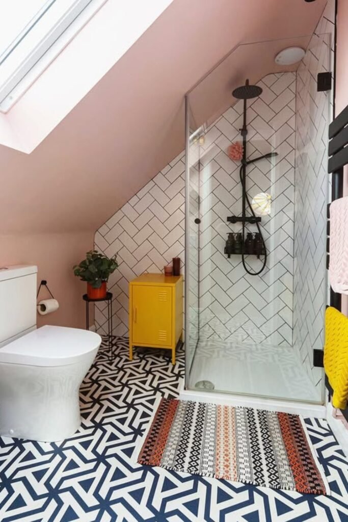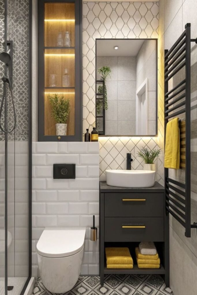The mix of geometric tiles and clean lines separates zones so you don’t need walls, while a dark vanity grounds the layout and yellow accents keep it lively.
