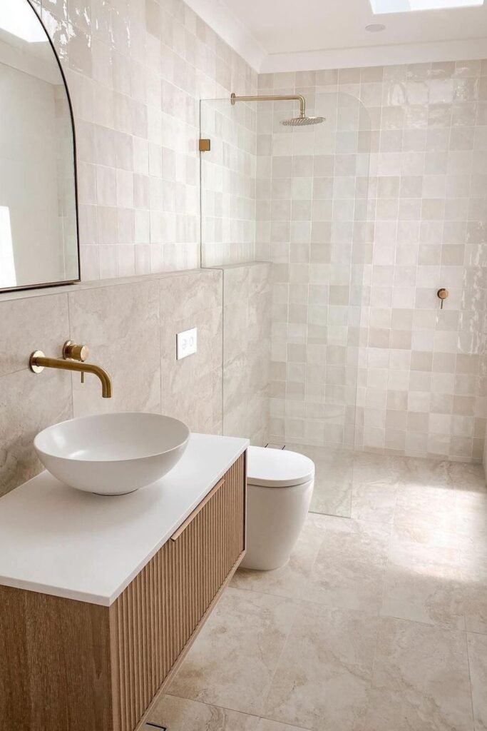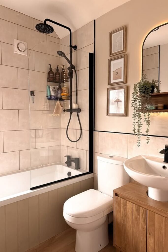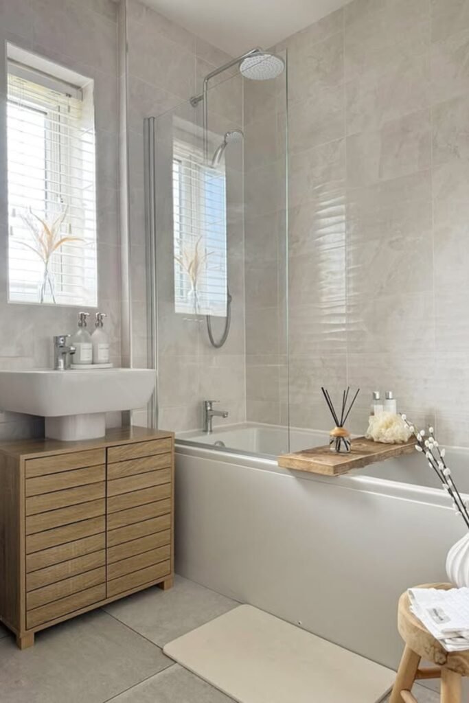 You will make a compact bathroom feel inviting and balanced by combining soft beige tiles with warm wood tones.