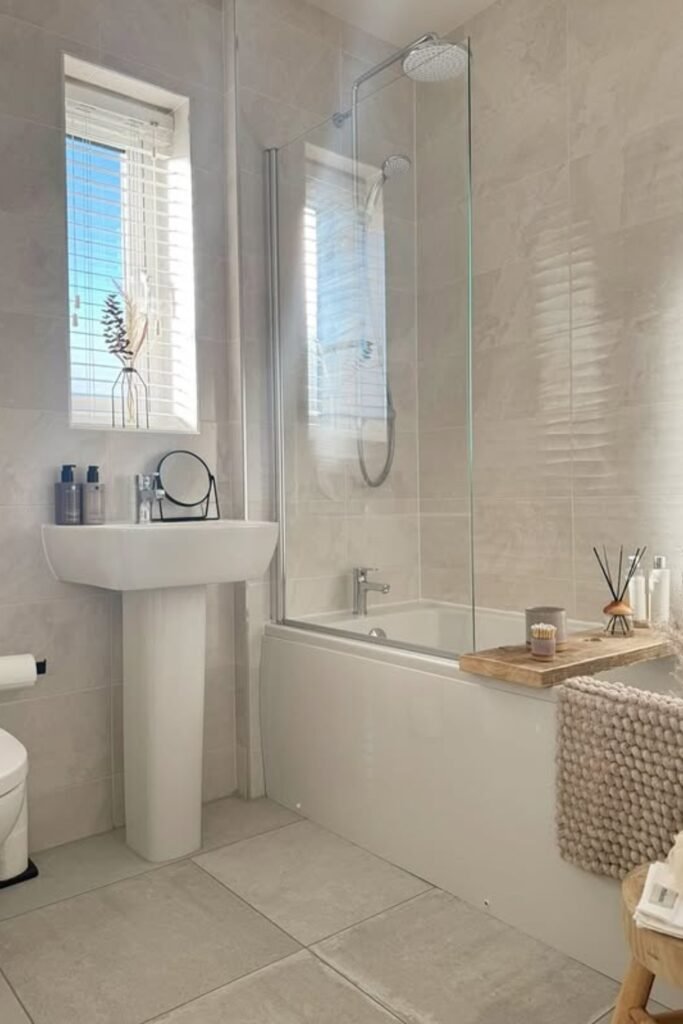 A frameless glass panel lets light spread across the tub area, while soft beige tiles keep things calm and clean.