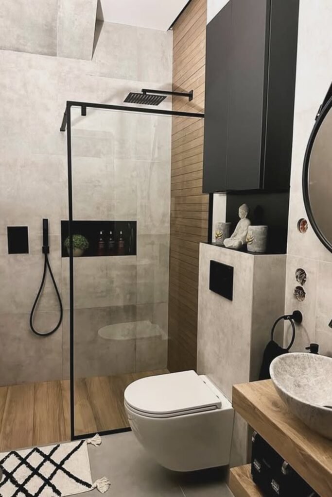 You can give your small bathroom a modern, edgy vibe by combining matte black fixtures with warm wood accents.